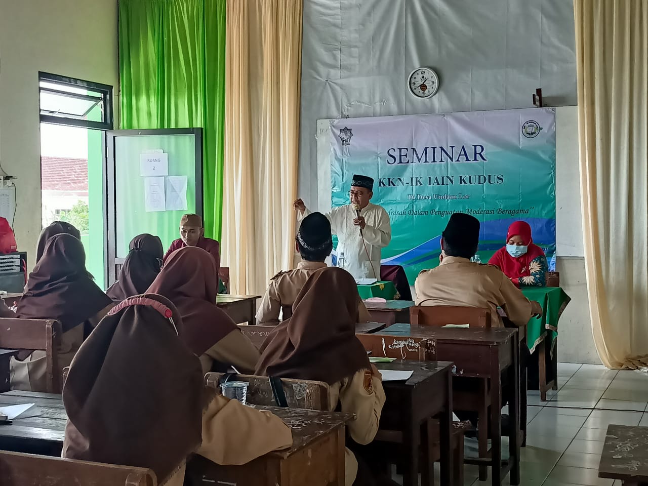 Tim Kuliah Kerja Nyata Terintegrasi Kompetensi (KKN-IK) IAIN Kudus 2021 mengadakan kegiatan nilai-nilai moderasi beragama untuk para pelajar di Undaan Lor. Kegiatan ini dikemas dalam bentuk seminar keagamaan dengan mengusung tema "Urgensi Madrasah Dalam Penguatan Moderasi Beragama" yang dilaksanakan pada hari Kamis, 16 September 2021 di Madrasah Aliyah Tamrinut Thullab, Undaan Lor. Tema tersebut dipilih karena melihat problematika di kehidupan nayata bahwa sekarang pemuda khususnya pelajar ialah insan yang masih labil baik dalam pergaulan maupun keyakinan, maka perlu adanya wejangan untuk para pelajar dalam menghadapi kehidupan yang beranekaragam khususnya dalam hal kepercayaan agar mereka bisa menyikapi keanekaragaman tersebut dengan pengetahuan yang luas dan dari berbagai sudut pandang. Bapak H. Asrofi Arief, S. Pd.I menjadi dipercaya untuk menjadi pemateri seminar moderasi beragama. Beliau adalah salah satu tokoh agama di desa Undaan Lor.