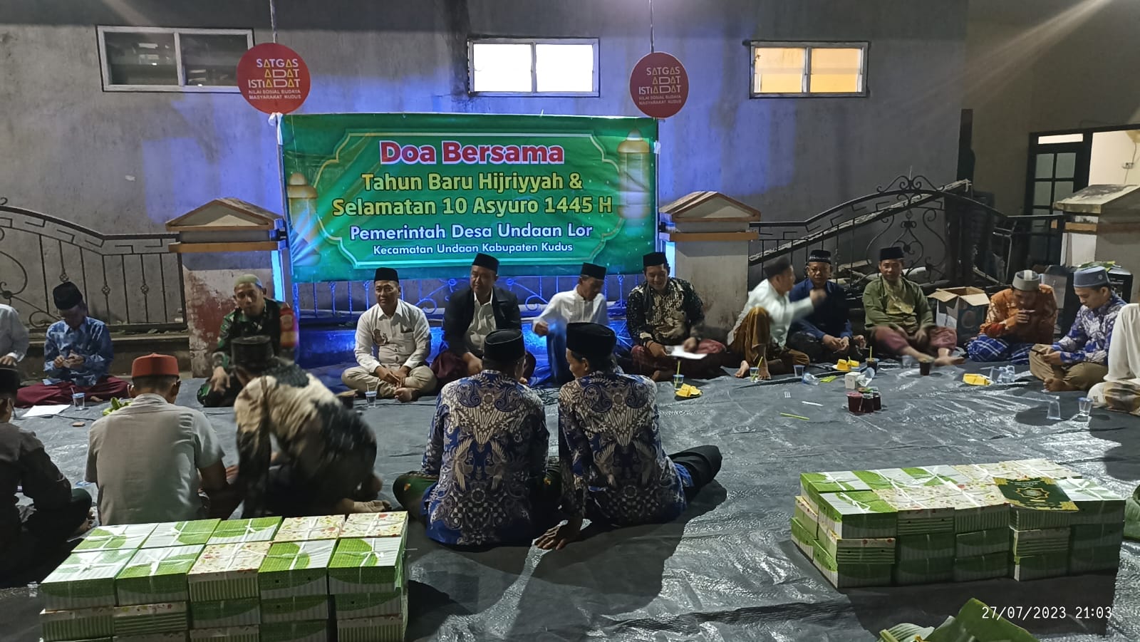 Undaan Lor - Pemerintah Desa Undaan Lor menyelenggarakan peringatan tahun baru hijriyyah 1445, pada tanggal 27 Juli 2023 atau bertepatan pada malam 10 Muharram 1445 H, acara tahun ini perdana dilakukan pemerintahan desa Undaan Lor, dengan kegiatan Do'a Bersama dan selamatan 10 Asyuro tahun 1445 Hijriyyah, untuk rangkaian acaranya di awali dengan tahlil, di lanjutkan dengan khotmil qur'an, dan di lanjutkan dengan istighosah dan di tutup dengan do'a.Kegiatan ini diikuti oleh Kepala desa, jajaran pemerintah desa Undaan Lor, BPD, lembaga desa, RT, RW, tokoh masyarakat, tokoh agama, kyai atau ulama' desa undaan lor, dan juga tutrut mengundang guru madin dan TPQ, kyai musholla dan masjid desa undaan lor.
